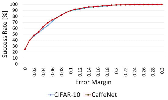 We evaluated the estimation accuracy of the CIFAR-10-based network and the CaffeNet-based network for selecting the network for the product change classification. Figure 12 shows the average success rate for on-shelf availability for all the shelves at various error margins. The vertical and horizontal axes are the success rate and the error margin, respectively. The blue and red lines show the success rates of the CIFAR-10-based and CaffeNet-based networks, respectively. As shown in Figure 12, the two networks barely differ in terms of the success rates for on-shelf availability, which means that the network for the product change classification can be selected on the basis of hardware resources such as memory size or system requirements such as processing time. We select the CaffeNet-based network for the product change classification since its success rate is slightly higher than that of the CIFAR-10-based network although it needs much memory (i.e., the model size is large).