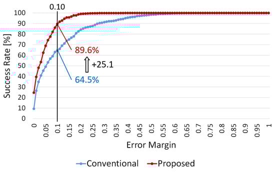 We compared the estimation accuracy of the proposed method with that of the conventional method [4], which is the state-of-the-art technology of out-of-stock detection. Figure 14 shows the average success rate for on-shelf availability for all the shelves at various error margins in this experiment. The red and blue lines show the success rates of the proposed and conventional methods, respectively. Our method (89.6%) improves the success rate by 25.1 points compared with that of the conventional method (64.5%) at the error margin of 0.10.