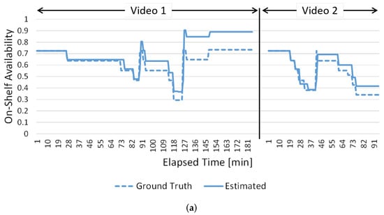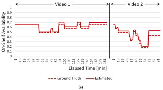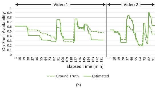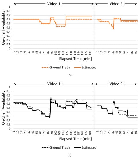 Figure 15 shows that our method accurately tracks the changes in on-shelf availability since the increases/decreases in on-shelf availability estimated by our method (solid lines) are very similar to those of the ground truth (dotted lines).