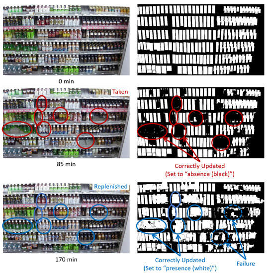 Figure 9 shows examples of the shelf condition updated by our method. The shelf condition at 0 min shows the initial shelf condition given in advance. As shown in Figure 9, our method updates the shelf condition, which frequently changes on the basis of “product taken” and “product replenished/returned” detected from the image.