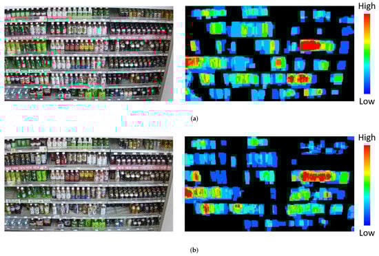 Figure 20 shows examples of another application using our method. Left and right images are a captured image and a heatmap, respectively. Each heatmap shows the accumulation of the product changes detected from the images. In other words, it shows which shelves shoppers frequently accessed. By visualizing such information, retailers can plan a suitable planogram (product layout) for increasing their profits (e.g., a planogram to reduce low-accessed shelves and a planogram to increase the number of products displayed on high-accessed shelves).