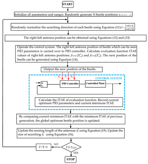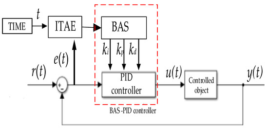 With the development of artificial intelligence science, artificial intelligence algorithms have been widely used in PID controllers to select reasonable PID parameters, for example the Genetic Algorithm (GA) [19,20], Particle Swarm Optimization Algorithm (PSO) [21,22], Firefly Algorithm (FA) [23,24], Cuckoo Search Optimization Algorithm (CS) [25], Grey Wolf Optimization Algorithm (GWO) [26], Ant Colony Algorithm (ACA) [27], and Bacterial Foraging Optimization Algorithm (BFO) [28]. The Beetle Antennae Search Algorithm (BAS) is an efficient and intelligent search algorithm proposed by Xiangyuan Jiang and Shuai Li in 2017 [29]. It is an evolutionary computation derived from the flocking and swarming behavior, foraging behavior and courtship behavior of beetles. The algorithm not only has the ability of individual recognition and environmental recognition, but also does not need to know the gradient information of the function. Furthermore, its program code is simple to implement, and it has an especially strong ability to obtain the best solution within a stable convergence property. BAS is used in neural network optimization [30], multi-objective energy management [31], investment portfolio problems [32], the prediction of the content of dissolved gases in power transformer oil [33], the determination of Young’s modulus in jet grouted coalcretes [34], prediction of permeability and unconfined compressive strength of pervious concrete [35], multi-objective optimization based BAS-WPT [36], and unmanned aerial vehicle (UAV) sensing and avoidance [37].