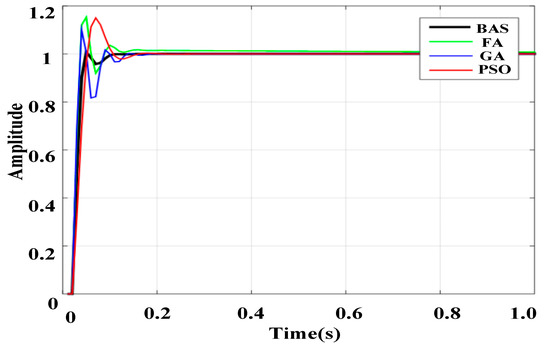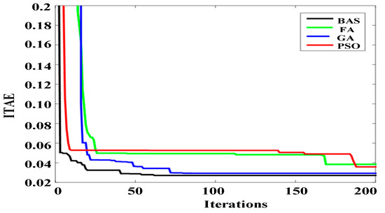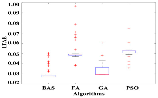 The box plot is shown in Figure 6 displays a set of scattered data. The stability of the control system can be shown by examining the position of the median, upper quartile, and lower quartile in the boxplot. The boxplot measures the dispersion of the ITAE value by graphical means. We note that the value of ITAE calculated by BAS has fewer outliers and a lower degree of dispersion than other algorithms, indicating that the proposed BAS has excellent stability. The median, upper quartile, and lower quartile of the ITAE calculated by BAS are lower than for other algorithms, which proves that BAS has excellent optimization capability.