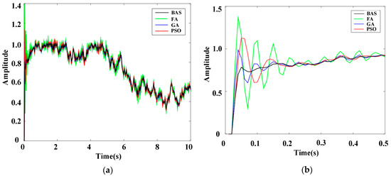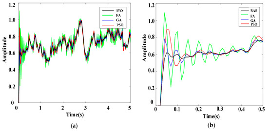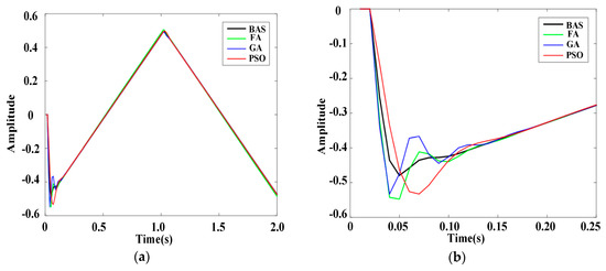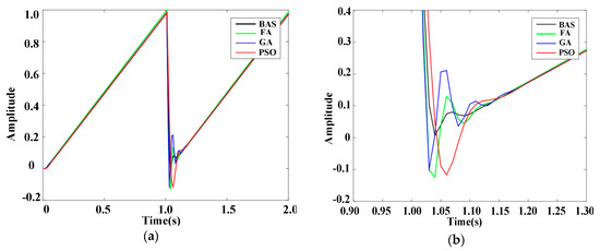 To further prove the reliability of the BAS-PID controller, response results of PID controllers based on different algorithms are presented in Figure 7 and Figure 8, when disturbance signals are the triangular wave signal and the sawtooth signal, respectively. Figure 7a shows the response curves of the triangular wave signal, and Figure 7b shows the local amplification of the response curves. Under the control of the BAS-PID controller, the amplitude error is the smallest and the smoothing speed is the highest. Figure 8a shows the response curve of the sawtooth wave signal, and Figure 8b shows the local amplification of the response curve. Figure 7 shows that the BAS-PID controller can not only restrain the disturbance signal but also enhance the dynamic characteristics and the steadiness of the robustness. For the two different interference signals, the system has a remarkable capability to maintain the stability and reduce the shaking and concussion when the BAS-PID controller is selected, and the performance of the system is unaffected by external interference.