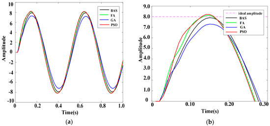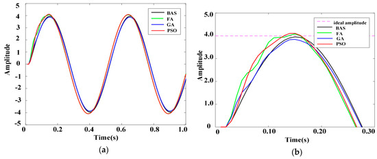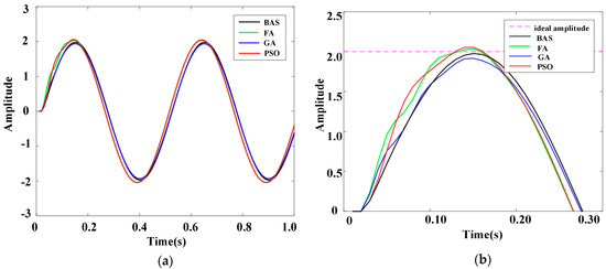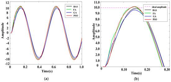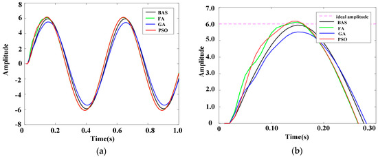 Figure 10b, Figure 11b, Figure 12b, Figure 13b, and Figure 14b show the local amplification curves for the five sinusoidal signals. It can be seen from Figure 10, Figure 11, Figure 12, Figure 13 and Figure 14 that the response curves for the BAS-PID controller have the smallest distance between the ideal amplitude and the actual amplitude. Therefore, we can infer that the BAS-PID controller has outstanding performance including vibrational stability, strong dynamic stiffness, and high mechanical impedance.