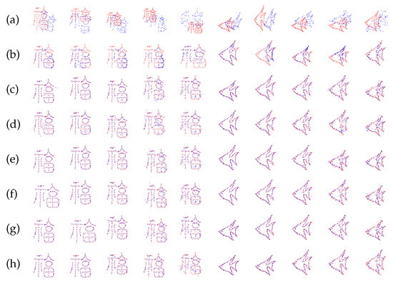 Registration results of point set registration algorithms on the fish and Chinese data with vary noise degradation. (a) The data with different gradation level; (b) iterative closest point (ICP); (c) thin-plate spline (TPS)-RPM; (d) CPD; (e) CPD-GL; (f) the proposed method with and ; (g) the proposed method with and ; (h) the proposed method with and .