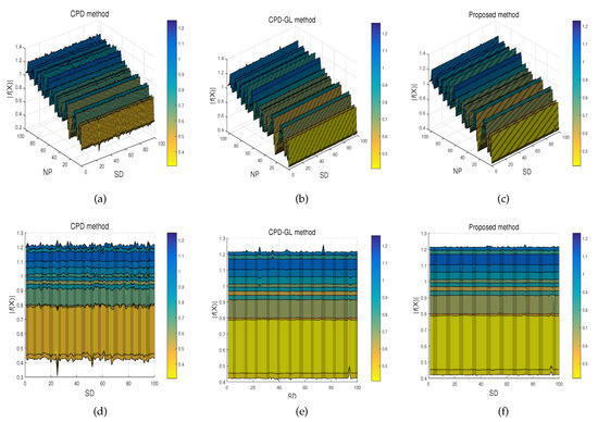 The performances of smoothness of the transformation by CPD, CPD-GL, and the proposed methods. Sub-figures (a), (b), and (c) show the performances of smoothness of the transformation using CPD, CPD-GL, and the proposed methods, respectively, while (d), (e), and (f) depict the same figures in another perspective.