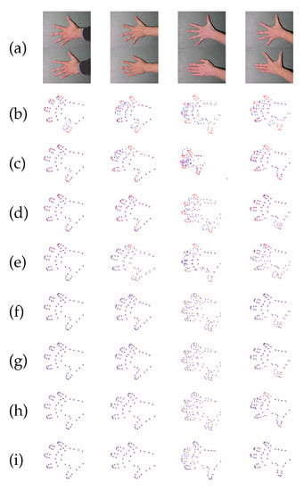 Four examples of IMM hand landmark registration results for each group. (a) four hand landmark images (b) target hand shape for each group (c) ICP (d) TPS-RPM (e) CPD (f) CPD-GL (g) the proposed method with and (h) the proposed method with and (i) the proposed method with and .