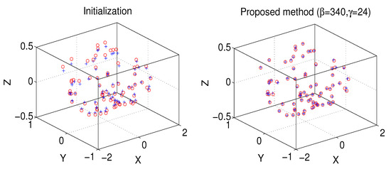 With respect to synthesized point set and IMM hand landmark, CPD-GL outperforms ICP, CPD, and TPS, whereas the proposed method with and has the almost same performance with CPD-GL method. Moreover, the proposed method with and has slightly better performance than the CPD-GL method, and the proposed method with and has the best performance. Then, the computational complexity of the proposed method is analyzed. The computational complexity for searching the K nearest neighbors for each local track in needs by using the tree, the computational complexity for performing the matrix needs , the EM algorithm needs almost . Therefore, the total computational complexity of the proposed algorithm is . All algorithms are implemented in MATLAB, and the tests are performed on a Core i7-4790 3.6GHz with 8GB RAM. The run-times of these algorithms are given in Table 1, which illustrates that the proposed method has almost the same computation time with CPD-GL method.