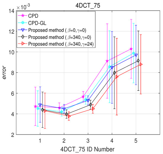 The 4DCT_75 dataset of the benchmark data from the DIR-lab http://www.dir-lab.com/index.html is used. The 4DCT_75 data contains ten (“case1” to “case10”) thoracic 4D CT images. Each 4D CT images have ten 3D CT images. In particular, we chose “4DCT_75_T00” as a model point set. The other five point sets (“4DCT_75_T10” to “4DCT_75_T50”) are set as the scene point sets. Thus, we have 50 pairs of point sets. The example of the registration result of the proposed method are shown in Figure 7, which the proposed method with and can align these point pairs. Furthermore, the registration errors of CPD method, CPD-GL method, and the proposed method are shown in Figure 8. It is shown that the proposed method with and has a better performance than the other methods.
