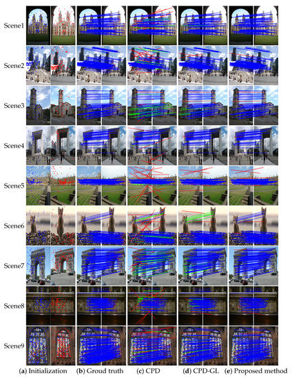 Different scenes on real image data. (a) different image pairs extracted feature points from scale-invariant Fourier transform (SIFT) algorithm (b) manual real correspondence, with results from (c) CPD method, (d) CPD-GL method, (e) proposed method. Each line segment corresponds to the position of the corresponding feature point in the two images (blue = true positive, green = false negative, and red = false positive). For visibility, 100 pairs are selected for some pair of images as presented, and the true negatives are not shown.