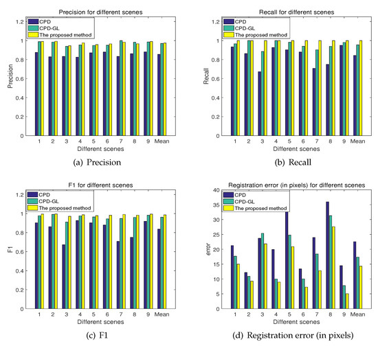 In this experiments, the real image pairs are obtained from the data of Jiayi Ma [31], Tuytelaars [32], the Oxford buildings dataset http://www.robots.ox.ac.uk/~vgg/data/oxbuildings, and the Paris dataset http://www.robots.ox.ac.uk/~vgg/data/parisbuildings. The SIFT algorithm is used to extract the feature points of each image, and the putative correspondence is created by nearest neighbor matching. The goal is to find correspondences/matches between two sets of feature points. The performance is evaluated by precision, recall, and F1, where the F1 measure is used to evaluate the balance between recall and precision. The precision, recall, and F1 are defined by: , , and , where , , and denote the preserved inlier number, the preserved correspondence number, and the inlier number contained in the putative correspondences, respectively. The ground truth is established in advance manually. The results of matching these image pairs are illustrated in Figure 9. It is observed that the proposed method can distinguish inliers from the outliers. Furthermore, the performance of CPD, CPD-GL and the proposed method in different scenarios is shown in Figure 10. It is observed that the proposed method achieves slightly better performance in precision, recall and F1 metrics compared to other methods. Furthermore, the registration error in pixels is proposed to evaluate the performance of these algorithms. Figure 10d demonstrates that the proposed method performs better than the CPD method and CPD-GL method. Based on the above evaluation results, the proposed method has better performance than other methods.