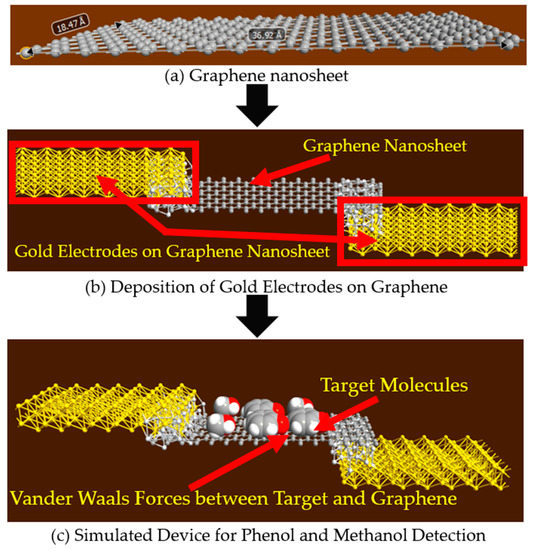 In our previously published work [35], graphene nanosheet based structures were used to detect the presence of phenol and methanol molecules. In this study the schematic of the simulated structure is shown in Figure 1. This graphene nanosheet has an approximate length of 37 Å and width of 18 Å, and is simulated with the ATK-VNL, as shown in Figure 1a. In the next step, gold electrodes have been deposited at both edges of the graphene nanosheet, as shown in Figure 1b. In step three, phenol and methanol molecules have been exposed to the surface of the simulated device to detect their presence. Van der Waals forces are acting between the target molecules and the graphene nanosheet, as the target molecules are only a few Angstroms above the surface of the graphene sheet, as shown in Figure 1c.