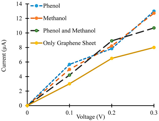 Figure 5 shows four different IV-curves for four different cases for the simulated device i.e., in the absence of target molecules, in the presence of phenol molecules, in the presence of methanol molecules and in the presence of both phenol and methanol molecules. An increase in the current for the device was observed in the presence of methanol, phenol and both phenol and methanol molecules. The adsorbed target molecules work as acceptors, or donors, for the graphene and change its conductivity [11,40,41]. Adsorbed target molecules were responsible for the change in the charge carrier’s concentration in the graphene nanosheet. If these molecules act as donors for graphene, then they increase its conductivity. Alternatively, the adsorbed molecules reduce the electrical conductivity of graphene if they are acting as acceptors [42]. The simulation results shown in Figure 5 reveal that the target molecules were acting as donors for the graphene nanosheet and changing the concentration of charge carriers in it, but this change in the concentration of charge carriers and conductivity was dissimilar for the different adsorbed molecules (i.e., phenol, methanol and both phenol and methanol molecules).