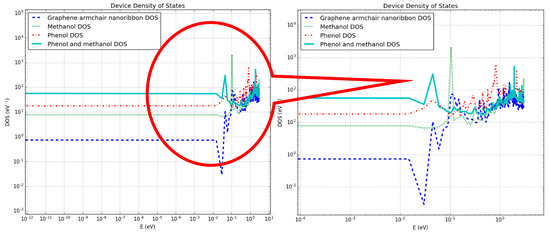 In another set of experiments, armchair graphene nanoribbon (AGNR) of approximately the same dimensions as the graphene nanosheet (dimensions are given in Figure 1 and Figure 3) were used for the detection of phenol and methanol molecules. The device density of states (DOS), IV-curves and photocurrent curves were calculated for the same target molecules. The purpose of detecting the same target molecules with AGNR was to analyze which graphene-based material was more sensitive and suitable for the development of a physical sensor. In Figure 6, energy vs. density of states was shown on logarithmic scales. In the magnified view (right image) of Figure 6, it can be clearly seen that the DOS of AGNR (dark blue dotted line), in the absence of target molecules, was significantly different from all other three DOS curves. In Figure 6, the green dotted line, red dotted line and solid greenish blue line are representing the DOS of the device in the proximity of methanol, phenol and both methanol and phenol molecules, respectively (also see the legend). It can be observed in Figure 6 that in the presence of methanol molecules, the abrupt spikes in energy states were not present between energy levels of 10‒2 to 10‒1 eV, as compared to that of the device in the absence of target molecules.