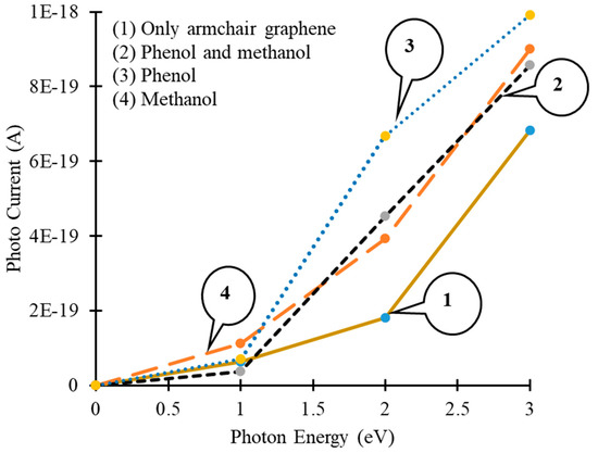 During the physical characterization process, the AGNR based device could be exposed to an artificial light source (a light bulb or LED) to generate a photocurrent. Then the change in photocurrent, in the presence of different target molecules, could be used as a signature signal to detect specific molecules. The AGNR based device was illuminated with photons, having energies between 0 to 3 eV, and the change in photocurrent was calculated for different target molecules, as shown in Figure 8.
