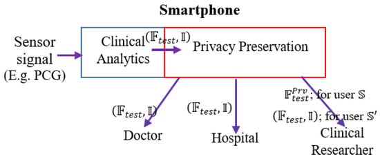We envision the following functional architecture for data-driven, on-demand privacy preservation of healthcare data (Figure 1). It is assumed that the analytical investigation of clinical data, captured from sensor device is performed at the edge, typically in a smartphone. Smartphone employs powerful data-driven algorithms for providing basic clinical analytics outcome. The main idea is the privacy preservation of the clinical analytics outcome based on the user’s preference. First, the trained model is developed with the given PCG signals. The constructed trained model is deployed. Test PCG signals are fed to the trained model. Let, the outcome over the tests signals be in the form of features on the test or field data and inferences: . For example, features may be the distinct properties of the data or analytics solution, which could be mean heart rate, heart rate variability and others of clinical significance, inference (decision like whether the PCG signal is from cardiac ‘normal’ or ‘abnormal’ subject). could be a flag indicating whether the PCG signal is from cardiac healthy or abnormal person. Next is the privacy preservation module, which is based on the demand (or setting) from the user, enables required privacy protection. Privacy preservation transforms the clinical analytics outcome . is a conservative user, she does not intended to disclose her clinical outcome to the clinical researcher in an anonymized but raw form. For example, a subject shares her PCG data to a number of stakeholders that include doctors, hospital, emergency service providers as well as the data management ecosystem include clinical researchers. However, feels uncomfortable to share data with others except the medical caregivers and the hospital. In such scenario, healthcare data is to be privacy preserved. In another case, does not feel data privacy requirement and she allows her healthcare data to be shared to all the stakeholders. Privacy preservation module obfuscates and shares for user . It is to be noticed that inference details are not shared when privacy preservation is required. In large number of scenarios, inference is binary, say pathological normal or abnormal. Hence we avoid sending binary information as obfuscation of such information is meaningless and consequently privacy preserved feature information ( is shared when privacy setting is ON for the destination (here, non-critical stakeholders in healthcare ecosystems like clinical researcher) and inference information is omitted.