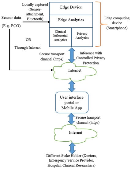 Our subsequent discussion is based on the functional architecture (Figure 1) and deployment architecture (Figure 2). When sensor data is fed to the analytics engine, the computational model consisting of feature set and trained model are generated. The generated model is deployed for prediction. It is envisaged that the trained model generation and trained model deployment are both developed and deployed on edge devices like smartphone. One of the salient aspects of our architecture is its capability to provide substantial clinical utility along with protecting the privacy requirement of the user. It is indeed an integrated method to ensure privacy protected clinical utility. Data at transit is protected through secure transport layer protocol (https). PCG signal captured by the sensors is sent locally or through the Internet. All the stakeholders access the information through a dedicated portal or mobile application.