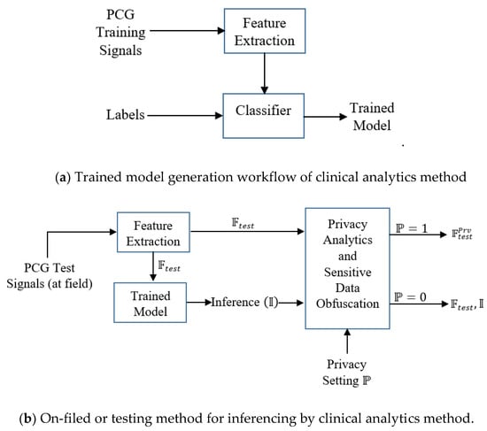 Our work has two main parts: 1. Analytics task: It provides classification of the physiological sensor signal (here, PCG) to detect the abnormal cardiac condition, 2. Privacy protection: It ensures that risk of sensitive data (e.g., features and inference from clinical analytics module) disclosure to unintended or non-critical stakeholders are minimized. These two parts are integrated. The analytics part enables clinical utility, while the privacy protection module warrants wide scale acceptance and practical importance.