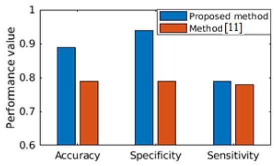 We conduct our experimentations using publicly available, expert-annotated MIT-Physionet Challenge 2016 PCG large database []. MIT-Physionet Challenge 2016 PCG contains more than 3000 PCG signals with ‘Normal’ and ‘abnormal’ labels corresponding to clinical normal of cardiac condition and clinical abnormal of cardiac condition, respectively. Precisely, the dataset consists of 3126 heart sound recordings or PCG signals, lasting from 5 s to around 120 s with 2000 Hz sampling rate. The abnormal PCG datasets are mostly from patients suffering with heart valve defects and coronary artery diseases. The first part of our work is to demonstrate the clinical efficacy of the proposed analytics method, where the task is to classify the given PCG signal as ‘Normal’ or ‘Abnormal’. We use stratified K-fold cross-validation (K=5) for performance result demonstration. We further show comparative performance with relevant state-of-the-art solution []. In Figure 6, performance comparison between the state-of-the-art [] is made, where both of the studies have considered the MIT-Physionet Challenge 2016 PCG large database [] for demonstrating the capability of the algorithms. We find that our proposed method outperforms the state-of-the-art method in all the three performance metrics, viz. accuracy, specificity and sensitivity. Hence, we can safely assume that the proposed clinical analytics method for detecting abnormal cardio-vascular condition from PCG signal has a large potential to provide clinical analytics outcome.