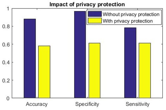The second part of our work is to demonstrate that on-demand, effective privacy protection can be applied on the feature sets such that revealing of the privacy-preserved features do not provide the attacker to guess the clinical condition of the user or the subject. When an attacker gets complete information , can derive the clinical inference quite effectively with (). We can surely claim that the inference engine has the capability of producing good learned model. Hence, we find a significantly accurate clinical inference. Such high accuracy inference ensures the minimization of both false negative and false positive alarm rates. The alert generated to the medical service provider is more reliable and subsequently the appropriate action ensures better prognostic. It is observed in Figure 6 that the proposed clinical analytics method is outperforming the relevant state of the art method [] in all of the performance metrics like accuracy, sensitivity, and specificity.
