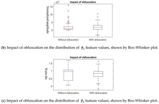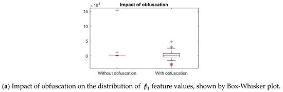 Further, we show that the proposed differential privacy protection that obfuscates and constructs that distorts the statistical properties of the data as shown in Figure 8. We use Box–Whisker plot to show that the distribution of data changes drastically with our obfuscation method, which confuses the attacker to derive effective inference. Box–Whisker plots show that the privacy-preserved feature space is transformed to a close to random outcome as well as significant statistical distortion.