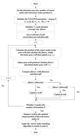 Application of the VFLGWO algorithm in WSN node deployment is shown in Figure 2. The steps of the VFLGWO algorithm are described as follows: