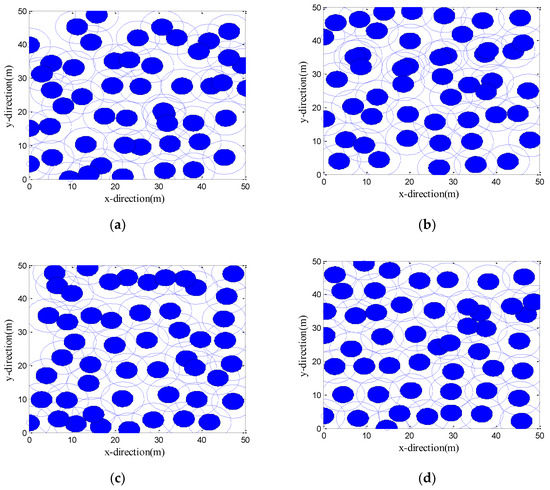 Figure 3 shows the initial positions of the sensor nodes. Figure 4a–d are the development of the best solutions (each large circle represents a schematic representation of the sensing area of the sensor nodes at its center, with a perceived radius Rs = 5 m) after one optimization by the CPSO, CS, LGWO, and VFLGWO algorithms. The coverage rate and uniformity of the CPSO, CS, LGWO, and VFLGWO algorithms for this experiment are listed in Table 4. It can be seen from Figure 4 that the sensor nodes have the most uniform distribution and the largest coverage rate after the VFLGWO algorithm is optimized. The experimental data in Table 4 also confirmed this conclusion.