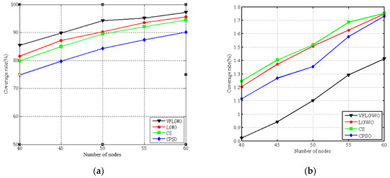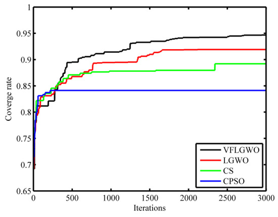 Figure 6 shows the network coverage rate curves of the four algorithms, CPSO, CS, LGWO and VFLGWO; running 3000 generations. It can be seen from Figure 6 that the coverage rate of the VFLGWO algorithm is significantly larger than that of the other three algorithms.