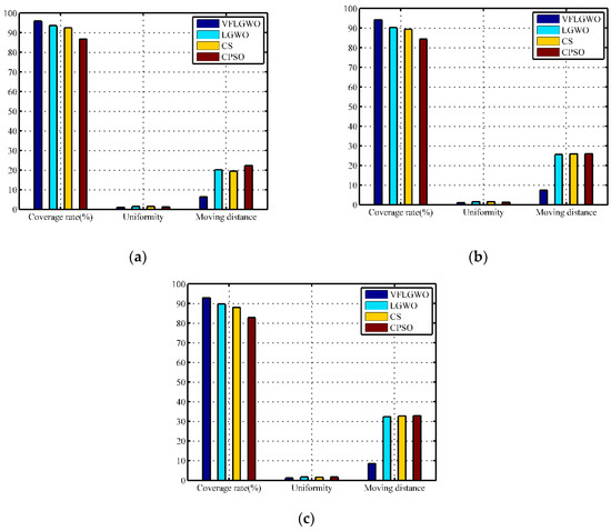 The monitoring area includes 32 sensor nodes in a monitoring area of 40 m × 40 m (50 m2/node), and 72 sensor nodes in a monitoring area of 60 m × 60 m (50 m2/node). The experimental results are compared with the experimental data of 50 sensor nodes placed in the monitoring area of 50 m × 50 m (50 m2/node) in Section 4.3.1. The results are shown in Table 9, Table 10 and Table 11. In order to facilitate visual comparison, the data of Table 9, Table 10 and Table 11 are plotted as histograms, as shown in Figure 8. It can be seen from Figure 8 that the VFLGWO algorithm is superior to the other three algorithms in coverage rate, uniformity, and average moving distance of the sensor nodes in different size monitoring areas.