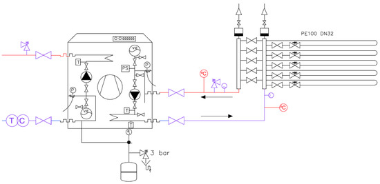 - Geothermal system: A horizontal collector consisting of 5 loops of 100 m is placed under the ground at a depth of 2 m. The heat pump is a MAMY Genius—10.3 kW, and it has a nominal electrical power consumption of 1.9 kW and a nominal thermal power of 8.4 kW. The energy is absorbed from the ground and it is used to heat a mixture of water and glycol.