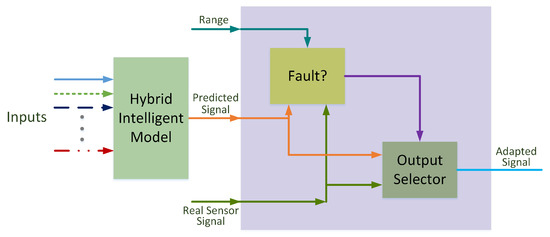 The scheme defined for fault detection and recovery approach is shown in Figure 3. It is possible to divide the figure into two parts: The model and the fault detection and recovery block. The first one gives the prediction of each sensor based on the measurements made by the rest of the sensors. The second one compares the prediction with the real measurement, and analyzes the deviation based on a defined range. If there is a significant deviation, the valid signal is the prediction. Otherwise, the real measurement is set at the output.