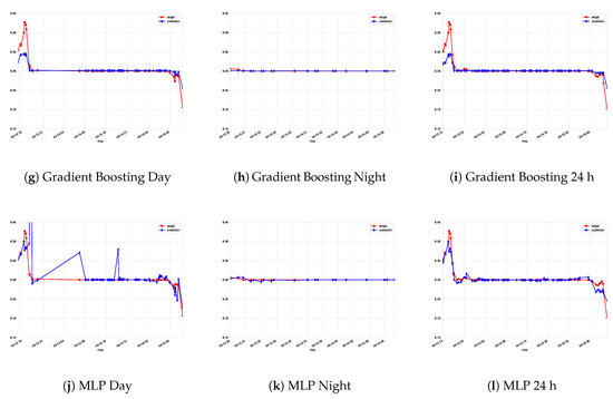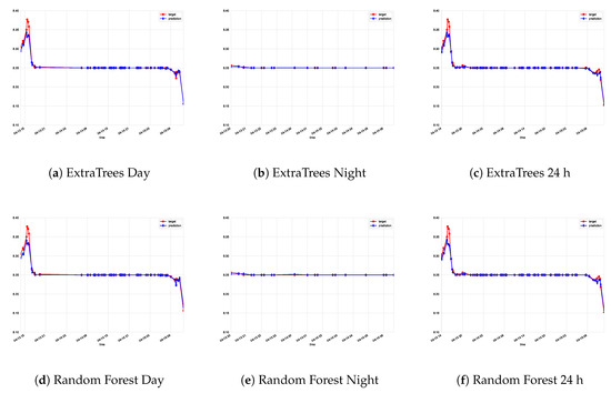 Actual data vs. predictions for Experiment A. ExtraTrees, random forest, gradient boosting, and MLP are considered for each model (day, night, and global model).