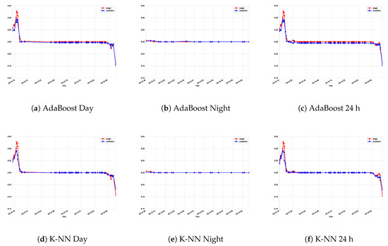Actual data vs. predictions for Experiment A. AdaBoost and k-nearest neighbors are considered for each model (day, night, and global model).