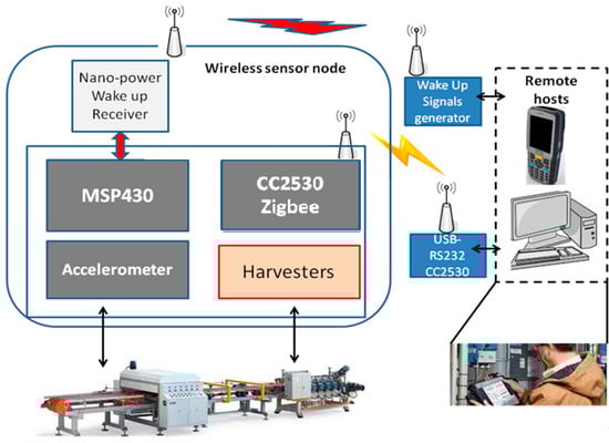 As mentioned in the introductory section, various industrial processes require routine maintenance to achieve the best manufacturing performance in terms of money spent both for consumed power and for replacement parts. The application scenario of this work is monitoring machinery using an accelerometer-based algorithm implemented in a low-cost energy neutral wireless sensor node. Figure 1 shows the basic idea of this approach where the wireless sensor node is attached to the machinery to measure both energy and information about the vibrations. A three-axis accelerometer, the CMA3000-D01 from Murata (Kyoto, Japan), has been employed, especially for the low power consumption of few μW and the small size. The accelerometer is interfaced with a microcontroller through a serial interface (SPI) and is sampled at 340 Hz to obtain data for the detection algorithm. A low power microcontroller (a MSP430 from Texas Instruments, Dallas, TX, USA) processes the vibration data directly onboard. The status of the monitored machinery is analyzed, classified and transmitted to a remote host when a critical wear situation is detected. In addition, the status can be requested by the remote host. To avoid the waste of precious energy for the idle-mode listening of the onboard radio, a nano-power wake-up radio is used for asynchronous communication []. Figure 1 also shows the building blocks of the developed wireless sensor node. It is built around the CC2530 system-on-chip and MSP430 microcontroller from Texas Instruments and a 3-axis accelerometer connected with a serial port (SPI) to the MSP430 microcontroller. The MSP430 has been chosen for the low power consumption, which is around 310 μW when supplied at 3 V and clocked at 1 MHz, and its capabilities are sufficient for managing the bandwidth of the sensor (340 Hz sampling) as well as performing the classification algorithm and the network activities in real time. On the other hand, the CC2530 is in charge of communication with the ZigBee protocol driven by the MSP430. This ZigBee chip has been selected as it provides the Z-STACK from TI using an open-source API implemented for the MSP430. Thanks to this stack the MSP430 can easily be programmed to control the data transmission using the ZigbeePRO radio through the CC2530.