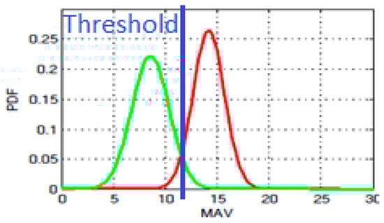 The threshold value is also an important parameter, as it can significantly affect the algorithm’s accuracy. To choose this value, a training phase is needed. The training phase is done off-line on the PC using an acquired dataset, i.e., it is not evaluated during the classification on the microcontroller. Figure 2 shows two Gaussian probability density functions (PDFs) fitted to the measured data along one axis and the corresponding selection of the threshold (‘new blade’ in green, ‘used blade’ in red). It can be noticed the maximum of the green curve is reached at the MAV value of 8 for the new blade and 14 for the old blade, such that the threshold for brass could be chosen optimally at 11 to distinguish between old and new blade. Other thresholds could be used to detect medium use blades, as we will show in Section 6. This process is repeated for all the materials to find the optimal thresholds. After the training period, the classification thresholds can be fixed in the run-time algorithm performed on the microcontroller. The run-time classification on the node is done with a simple decision tree with 1 level (the MAV value) and 3 leaves/classes (new/medium/old) according to 2 thresholds decided in the training phase.