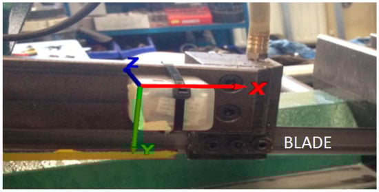Sensor node mounted on the bandsaw’s arm and its orientation.