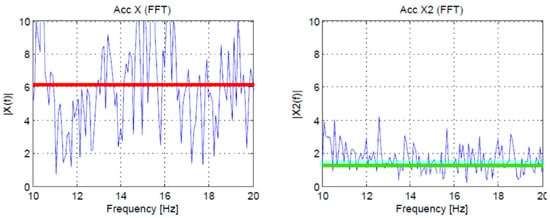 Accelerometer data in the frequency domain and mean absolute value (red and green horizontal line) evaluated in the frequency domain in the range 10–20 Hz during 10 s of brass cutting. On the left side, there are the plots for an old blade. On the right side the plots for a new blade.