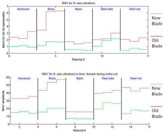 Both MAV evaluations were done using only the -axis data from the accelerometer (frequency for the first plot, amplitude in time for the second). The materials used during the dataset acquisition were aluminum, brass, nylon, steel tube and steel rod. The cut for each material was done three times, using an old blade and a new blade to evaluate the vibration in two extreme conditions. The first plot shows the MAV value in the frequency domain obtained using the data from the accelerometer, acquired at 340 Hz for 10 seconds, evaluating the mean absolute value of the FFT in the range 10–20 Hz. Both plots show that there is a large difference between vibrations produced with a new blade and an old blade. Moreover, the plots show how the frequency approach is very similar to the time domain approach, although for the limited resources of the microcontroller the time domain approach can be performed faster and with lower power consumption. On the -axis of the plots, there are the fifteen samples evaluated (three per material).