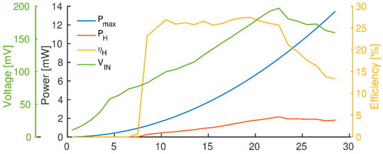 For temperature differences from 0 up to 28 °C, the graph shows the maximum power for matching load condition (2.78 Ω load) and the harvested power . For , all the conversion losses have already been considered, since it shows the power that is actually transferred to the storage capacitor. One can recognize the very low TEG harvesting efficiency of around 20%, even using state-of-the-art commercial harvesting chip. Moreover, notice that the harvesting circuit is not able to harvest energy if the TEG input voltage is not at least 63 mV. To satisfy this condition, the TEG needs at least 5 °C temperature difference (only 20 μW), below this threshold the harvested power drops to zero. However, as shown in Table 5. it is possible to harvest between 20 μW (at 5 °C temperature difference) and 3 mW (at 28 °C temperature difference), which is a suitable value for our application.
