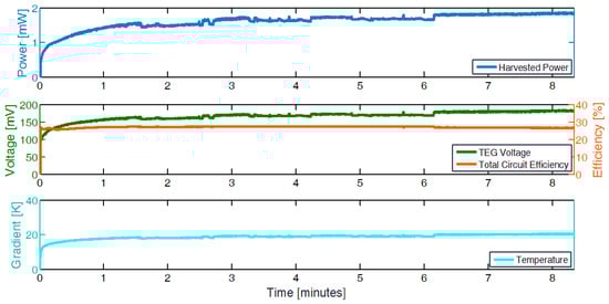 To evaluate the effective power harvested, we measure the temperature gradient on the TEG during 8 minutes of cutting during the data acquisition tests on the Pedrazzoli SN270 motors. Using the accurately measured data of the TEG in the thermal chamber and the temperature gradient during the cutting process, we estimated the harvested power after the conversion circuit and the voltage of the TEG. Figure 7 shows the temperature gradient measured, the expected power harvested, and the TEG voltage in the application scenario. Moreover, it is possible to notice that the temperature increases during the process and becomes stable only after 6 minutes, giving more than 1.8 mW of power, although it is possible to start harvesting energy after only a few seconds. In fact, the experimental results show that after the initial 15 second period, the average effective energy harvested is higher than 1 mJ per second.