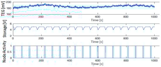 Perpetual work of the whole system supplied by the TEG energy harvester. TEG voltage, storage level, and wireless node activities. The picture shows only 15 minutes for legibility reasons but has been performed for several hours.