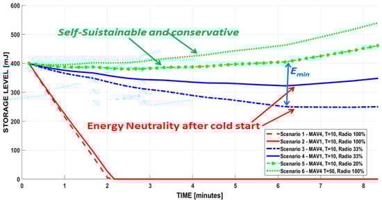 Simulation confirms that using storage is useful to guarantee the cold start of the system. In fact, as the TEG harvester starts to produce stable energy after a few minutes, the solution is energy autonomous only after that time. However, the wireless node can work using a part of the energy stored before and it is able to recharge the storage later when the energy harvester provides more energy. In these conditions, our system can work perpetually, and it can have a buffer of energy that is ready for the next cold start phase (assuming ultra-low leakage current of the storage). From these experimental results, it is also possible to evaluate the minimal energy (Emin) needed to guarantee the cold start condition to satisfy (7). The cold start is due to the fact that the energy acquired when the machinery is not active for long periods (i.e., one or more nights) is lower than after a few minutes of work activities. This value depends on the application scenario, as Figure 9 shows. For example, for Scenario 5 and 6, only 10 mJ and 20 mJ are needed to guarantee the cold start, while for scenario 3 at least 160 mJ are needed.