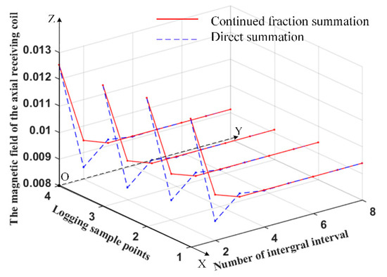 It can be seen from Figure 2 and Figure 3 that, for the red lines the magnetic field responses remain unchanged after three or four integral intervals and are accumulated. For the blue dotted lines, the magnetic field responses remain unchanged after about six integral intervals and are accumulated. It can be concluded that the continued fraction summation converges faster than the direct summation when calculating the magnetic field formulas.
