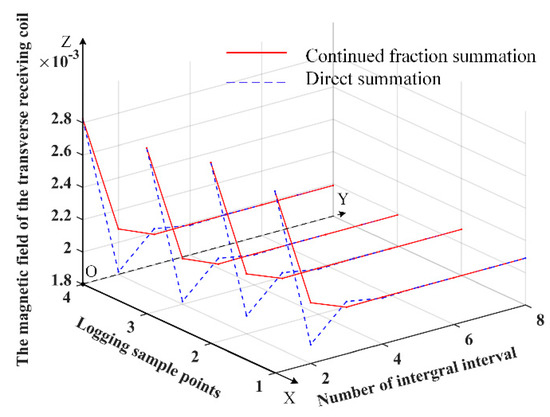 It is necessary to accumulate its integral intervals when calculating the infinite integral of the Bessel function in magnetic field formulas. The summation of integral intervals is calculated by direct summation and continued fraction summation. In order to see the convergence results in the calculation process, we compared the convergence of the infinite integral of the Bessel function in magnetic field formulas of the axial receiving coil with that of the transverse receiving coil by the continued fraction summation and the direct summation, respectively. Four observation points were selected in the formation to observe the change of the results of the magnetic field responses with the number of integral intervals. The results on the axial receiving coil and the transverse receiving coil are shown in Figure 2 and Figure 3, respectively. In Figure 2 and Figure 3, the horizontal axis represents the number of integral intervals and logging sample points, and the vertical axis represents the magnitude of the magnetic field. The red lines represent the results of the continued fraction summation, and the blue dotted lines represent the results of the direct summation.