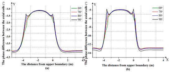 The phase difference between the axial receiving coils at a frequency of (a) 400 kHz and (b) 2 MHz.