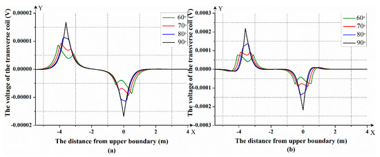 Figure 4a,b shows the phase difference between the axial receiving coils at a frequency of 400 KHz and 2 MHz. It can be seen that there will be mutations at the formation boundary, and as the formation resistivity changes, the magnitude of the phase difference also changes. Figure 5a,b shows the voltage of the transverse receiving coil at a frequency of 400 KHz and 2 MHz. It can be seen that the closer the LWD instrument is to the formation boundary, the larger the voltage of the transverse receiving coil. The farther the LWD instrument is from the formation boundary, the closer the voltage of the transverse receiving coil is to zero. The azimuth response characteristics in different directions will be produced when the instrument enters the low resistivity layer from the high resistivity layer or the instrument enters the high resistivity layer from the low resistivity layer. Therefore, it can distinguish whether the LWD instrument is entering the layer or going out of the layer.