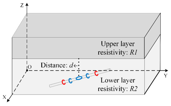 With the development of high angle wells and horizontal wells, logging while drilling (LWD) has received widespread attention for geological exploration [1]. The data used in pre-drilling research are uncertain, which will cause the horizontal wells drilled along the design track to not be in the optimal position in the reservoir, thus affecting the drilling effect of the target formation. LWD data can determine the location of the LWD tool and adjust the trajectory of the wellbore in real time [2]. In the process of high angle and horizontal well drilling, real-time adjustment of the well trajectory based on LWD data can help the oil field to improve the return of the drilling investment [3]. The traditional electromagnetic LWD tool using the axial launching and receiving antenna, does not have azimuth detection characteristics. The instrument used in this study is equipped with a transverse antenna based on traditional instruments. These electromagnetic LWD tools are widely used in geo-steering because the measurement results have azimuth characteristics and can better determine the orientation of the formation boundary [4,5]. They provide formation resistivity evaluation and instrument position information [6]. In the actual measurement while drilling, it is inevitable to encounter the influence of formation factors such as the wellbore and the electrical influence of the instrument itself; therefore, symmetry compensation transmitting coils are added.