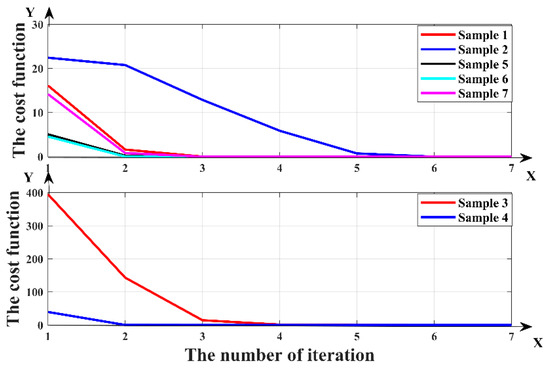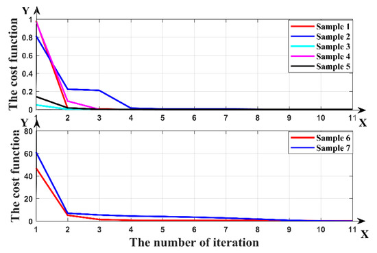 Seven formation samples were randomly selected to test the accuracy of the inversion. We set the initial values for the inversion and calculate the cost function. Accurate inversion results can be obtained by continuously reducing cost function. The true values, initial values, iterations and inversion results in the three-parameter inversion are shown in Table 3. When setting the initial values, many situations were considered, such as whether the initial value of the boundary distance parameter is the same or opposite to the positive and negative sign of the real value, and whether the initial resistivity parameter was larger or smaller than the real value. The cost function of inversion samples varying with the number of iterations in the three-parameter inversion are shown in Figure 8.