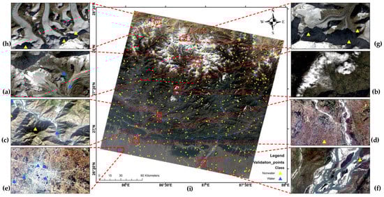Pansharpened Landsat 8 natural color composite image with water and non-water reference dataset; (i) Each red box represents different surface water bodies and noises case in the scene (a–h).